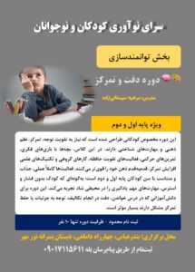 دوره دقت و تمرکز در سرای نوآوری کودک و نوجوان دبستان نورمهر مخصوص کودکانی طراحی شده است که نیاز به تقویت توجه، تمرکز، نظم ذهنی و مهارتهای شناختی دارند. در این کلاس، بچهها با استفاده از بازیهای فکری، تمرینهای حرکتی، فعالیتهای تقویت حافظه و کارهای گروهی، بهطور تدریجی مهارتهای خود را در افزایش تمرکز و تقویت ذهن گامبهگام تقویت میکنند.